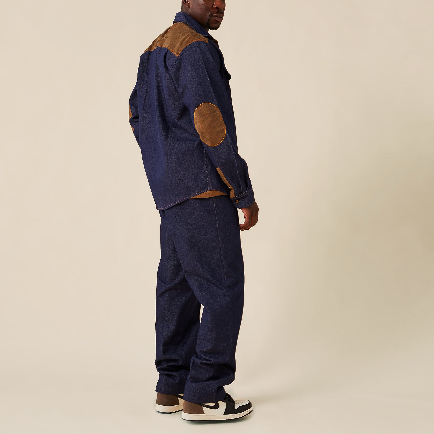 Two-pocket denim shirt with faux suede trim.