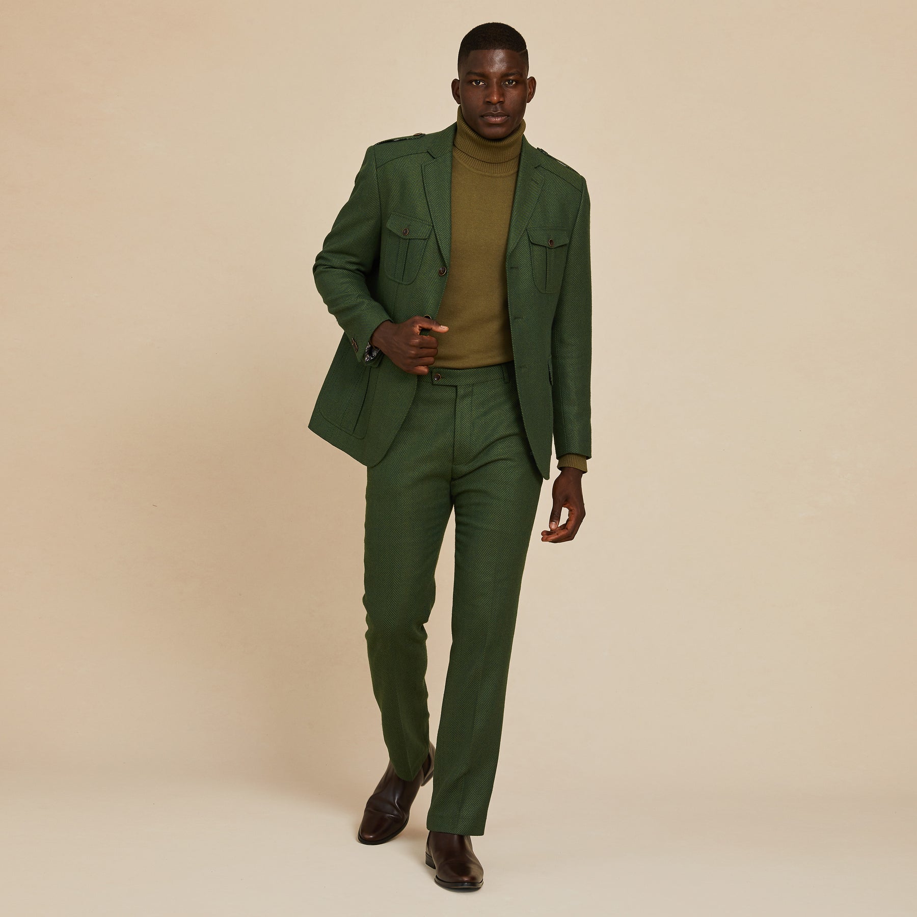 Military inspired 4-pocket blazer with wool blend herringbone pattern fabric.