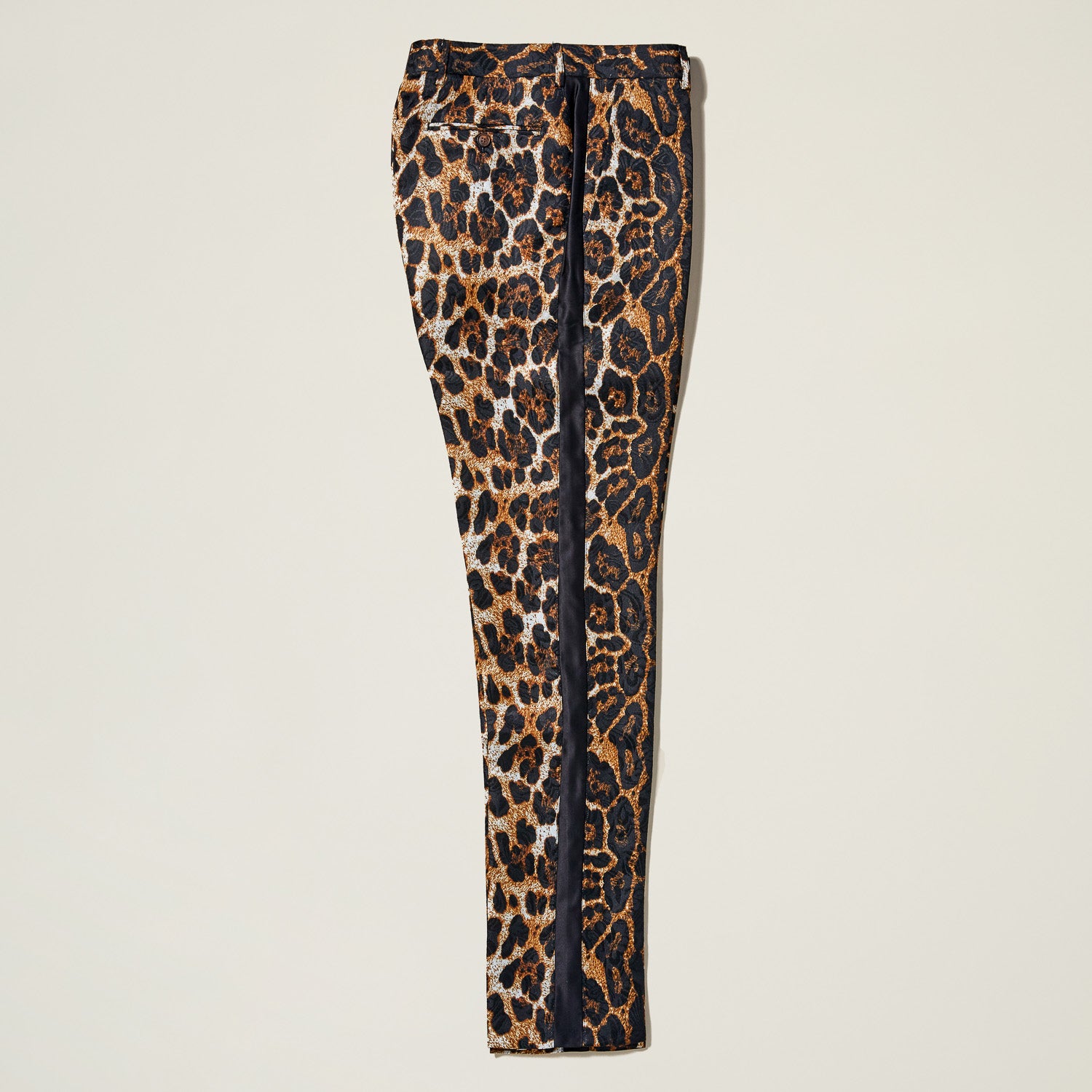 Poly-blend jacquard cheetah print pant with solid satin tuxedo stripe along outer leg.